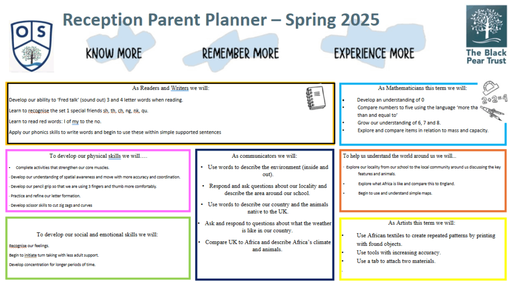 In maths we will be exploring 3D shapes and their properties. Following on from our addition work in Autumn, we will be finding different ways to make 5 and 10. We will be introducing the concept of subtraction through songs and practical activities. The children will continue to use tens frames and part-part-whole models to support their understanding of calculations.